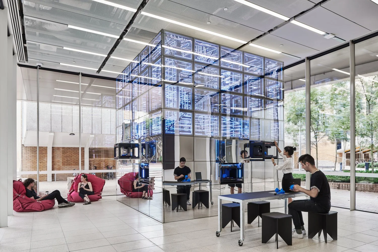 The space integrates a 3D printing farm of 32 printers, augmented and virtual reality environments, 3D scanning technology, and a programmable interactive LED installation, as well as room to run studios, seminars and support sessions, allowing people to experience and collaborate on new platforms.